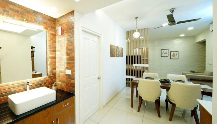 Wall : Ceramic glazed tile, special effect paint and mirror.Exhaust fan : Provided in all toilets.